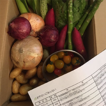 | 特色 | 契約農家よりの旬の野菜を、定期的に宅配してくれるサービス。サイズが3種類、毎週か隔週からコースが選べる。作り手の情報、野菜の保存方法、料理法などが書かれた説明書が毎回同封され、月に1回、野菜のレシピなどを掲載したカラー刷りの刊行物も届けられる。